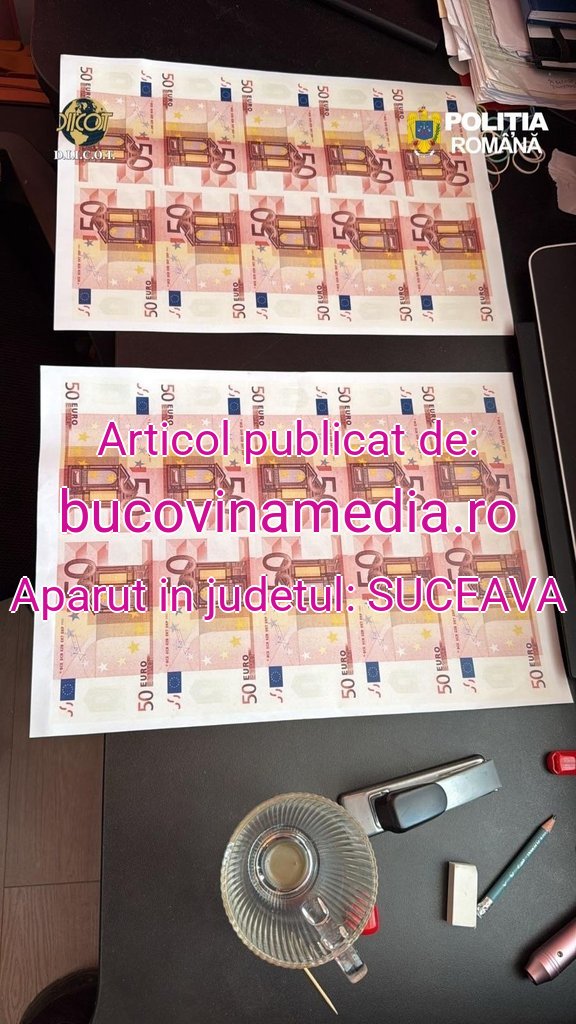 Până la acest moment, la una dintre locații, a fost găsită ”o fabrică de bani” amenajată într-un imobil aflat în construcție. Au fost identificate și ridicate imprimante, diferite componente electronice, hârtie specială pentru imprimarea bancnotelor și bancnote contrafăcute, în cupiură de 50 și 100 euro.Activitățile continuă, urmând ca audierile să se desfășoare la sediul DIICOT – Serviciul Teritorial Iași.Acțiunea a fost realizată cu sprijinul jandarmilor din cadrul Inspectoratului Județean de Jandarmi Suceava și Brigăzii Speciale de Intervenție a Jandarmeriei.Facem precizarea că, pe parcursul întregului proces penal, persoanele cercetate beneficiază de drepturile și garanțiile procesuale prevăzute de Codul de procedură penală, precum și de prezumția de nevinovăție.